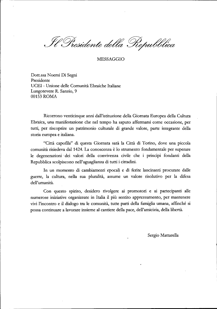 Pubblichiamo di seguito il messaggio del Presidente della Repubblica Italiana Sergio Mattarella inviato alla Presidente UCEI Noemi Di Segni in occasione della Giornata Europea della Cultura Ebraica 2024, svoltosi il 15 settembre in tutta Italia, con Torino città capofila. Il messaggio è stato letto il mattino della Giornata, all’interno dei saluti delle Autorità.