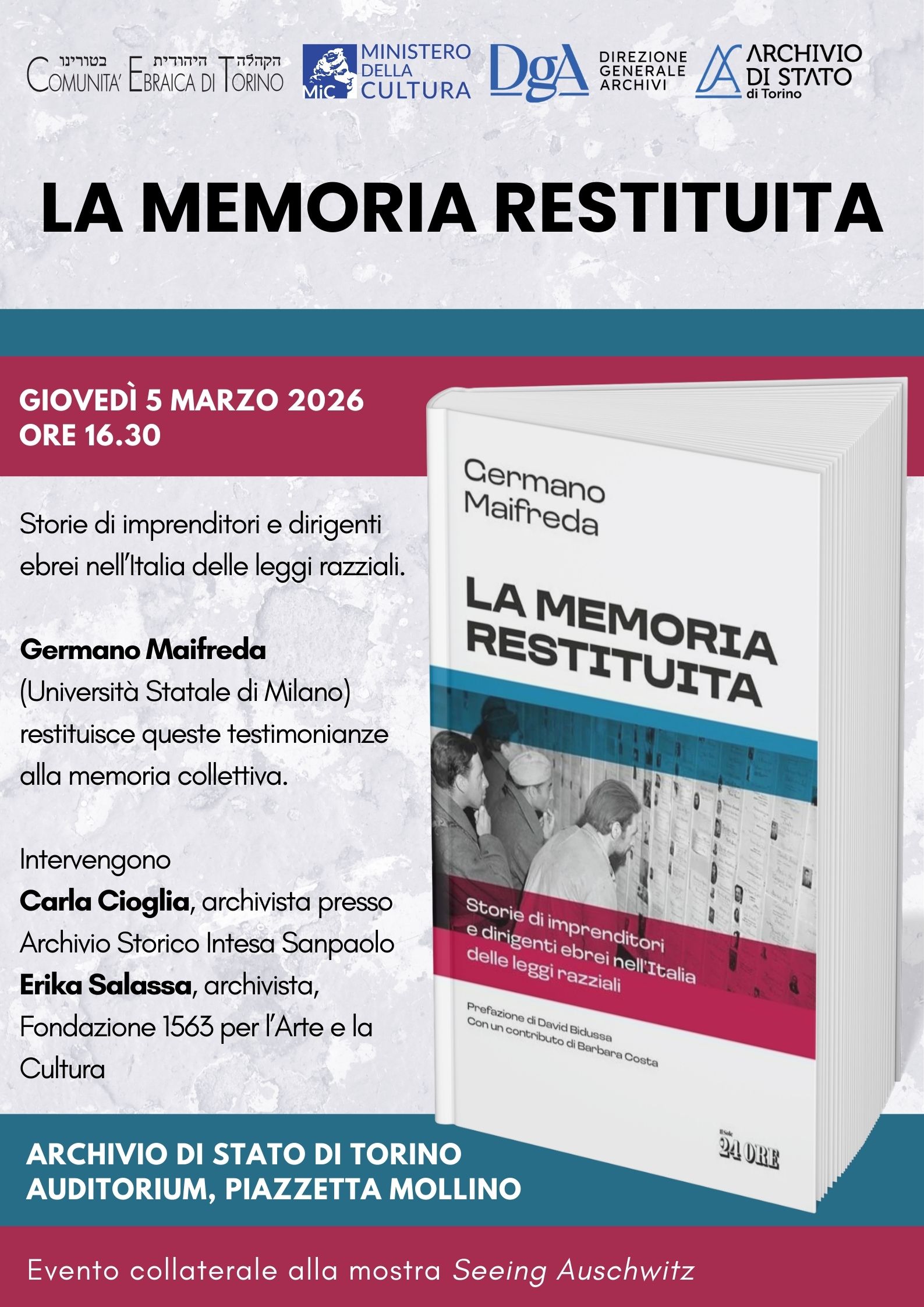 Speakers include Carla Cioglia, archivist at the Intesa Sanpaolo Historical Archives, and Erika Salassa, archivist at the Fondazione 1563 per l’Arte e la Cultura.