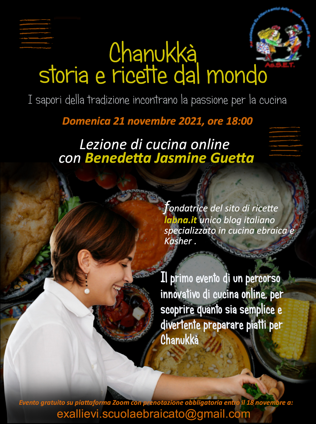 Il primo evento di un percorso innovativo di cucina online con Benedetta Jasmine Guetta, autrice e fondatrice del sito di ricette labna.it, unico blog italiano specializzato in cucina ebraica e kasher, per imparare a cucinare incredibili cibi ebraici e scoprire quanto è divertente e semplice preparare piatti per Chanukkah.