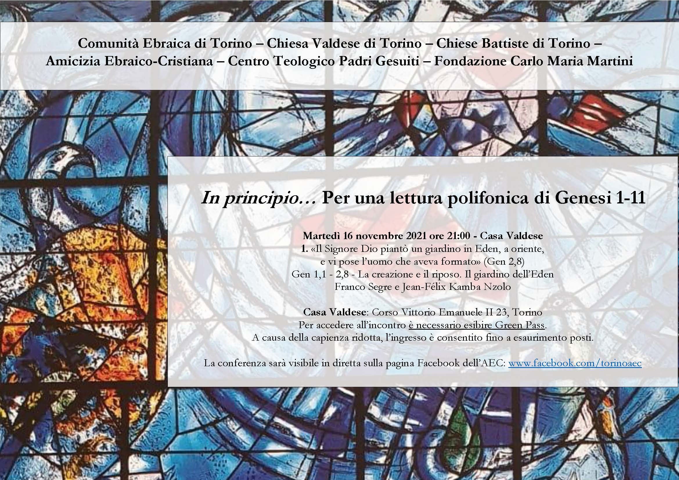 La conferenza, tenuta da Franco Segre e da Jean-Felix Kamba Nzolo, apre un ciclo di incontri/letture a due voci (ebraica e cristiana nelle sue diverse componenti) dedicato a Bereshit, in particolare 1-11, che si svolgerà dal 16 novembre al 31 maggio, presso diverse sedi rappresentative dei gruppi partecipanti.