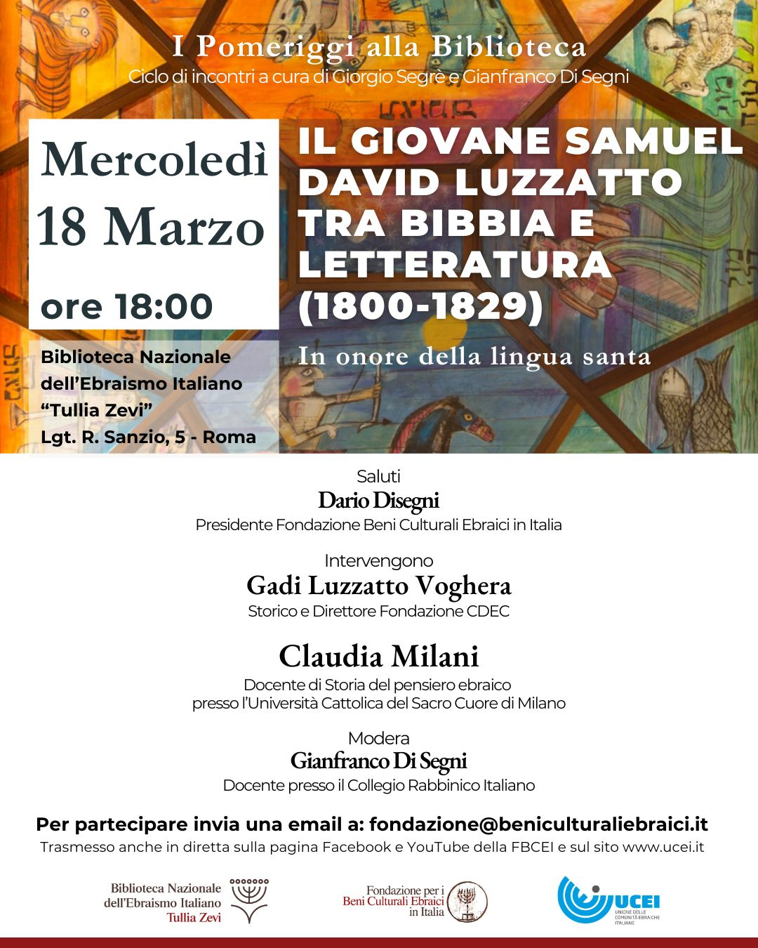 L’evento sarà dedicato alla figura di Samuel David Luzzatto (Shadal), tra i maggiori intellettuali dell’ebraismo italiano dell’Ottocento.