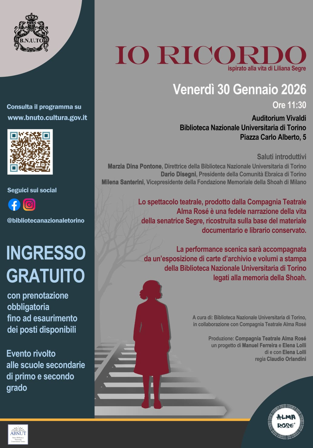 Venerdì 30 gennaio 2026, alle ore 11.30, l’Auditorium Vivaldi della Biblioteca Nazionale Universitaria di Torino ospiterà Io ricordo, uno spettacolo teatrale intenso e toccante, ispirato alla vita della senatrice a vita Liliana Segre, figura simbolo della memoria della Shoah e testimone diretta della deportazione nei campi di sterminio nazisti.