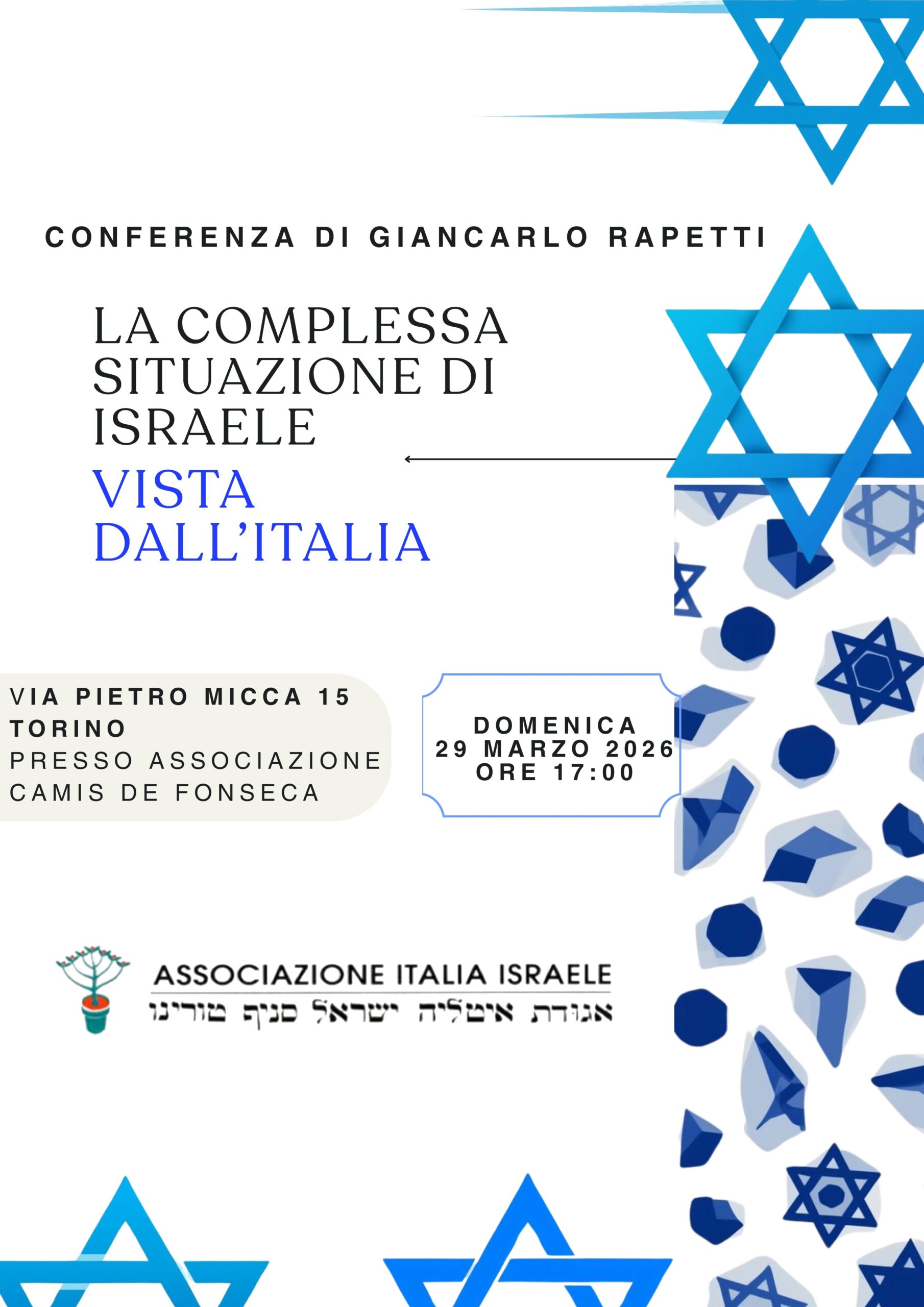 Il prossimo appuntamento dell’Associazione Italia Israele di Torino si svolgerà domenica 29 marzo 2026: il nostro socio Giancarlo Rapetti terrà una conferenza dal titolo LA COMPLESSA SITUAZIONE DI ISRAELE VISTA DALL’ITALIA.