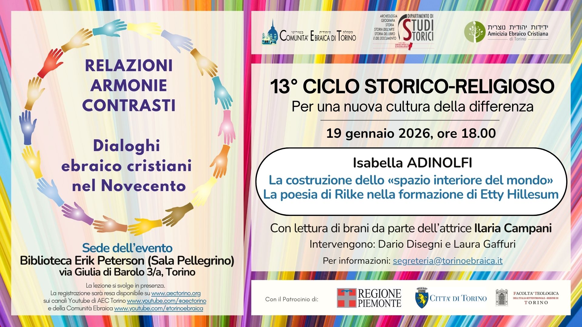 Gli incontri si svolgeranno in presenza e saranno disponibili successivamente sulla pagina web www.aectorino.org e sui canali Youtube di AEC Torino e della Comunità Ebraica.