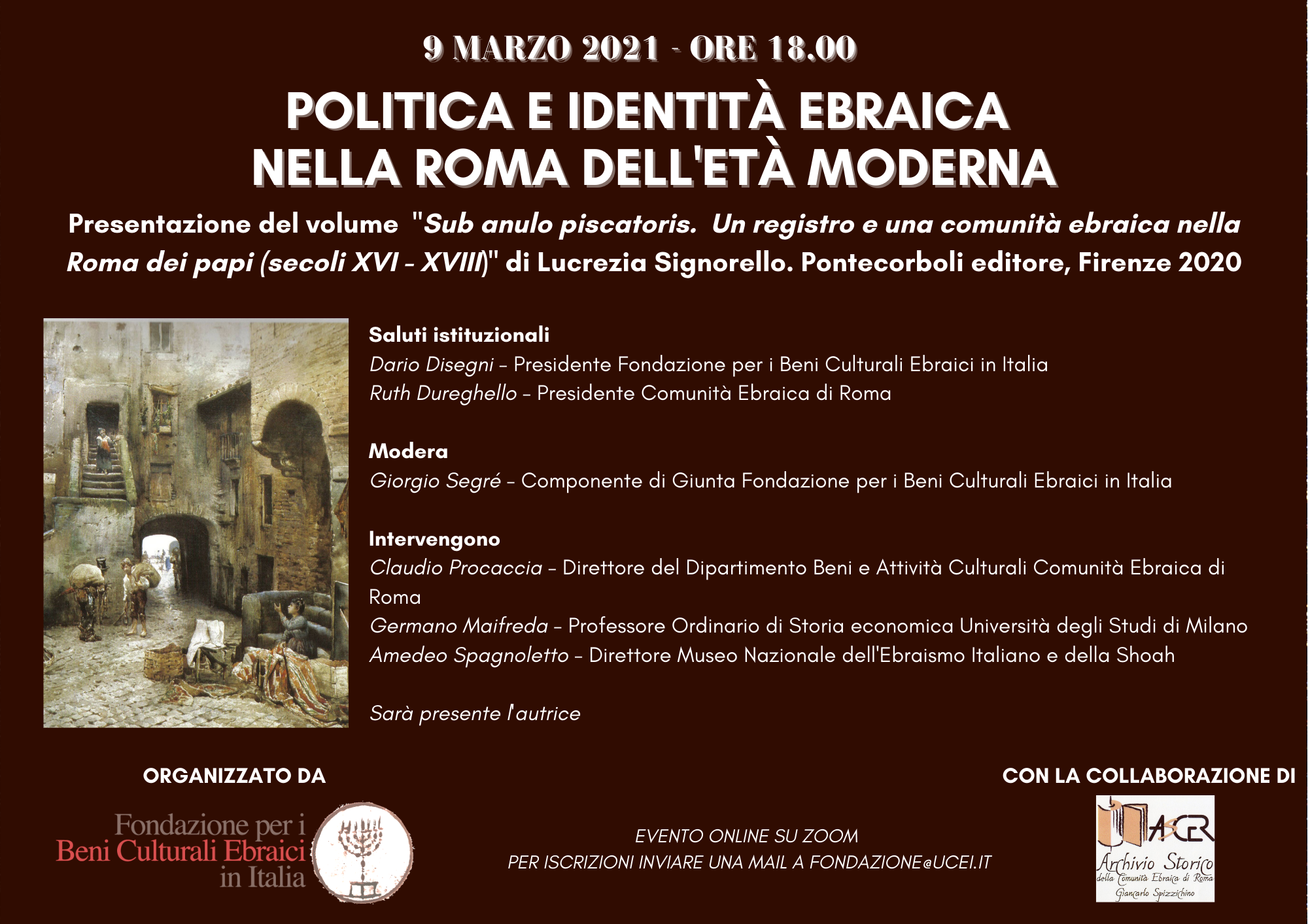 Presentazione del volume “Sub anulo piscatoris. Un registro e una comunità ebraica nella Roma dei papi (secoli XVI – XVIII)” di Lucrezia Signorello. Pontecorboli editore, Firenze 2020.